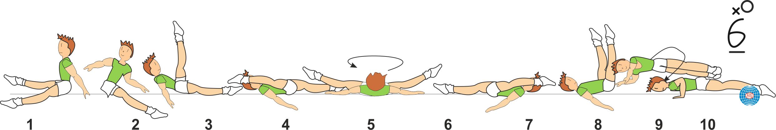 - The leading leg crosses over the other leg to initiate the rotation, one arm on the floor at the beginning of the movement. Perform a 360° turn on back.